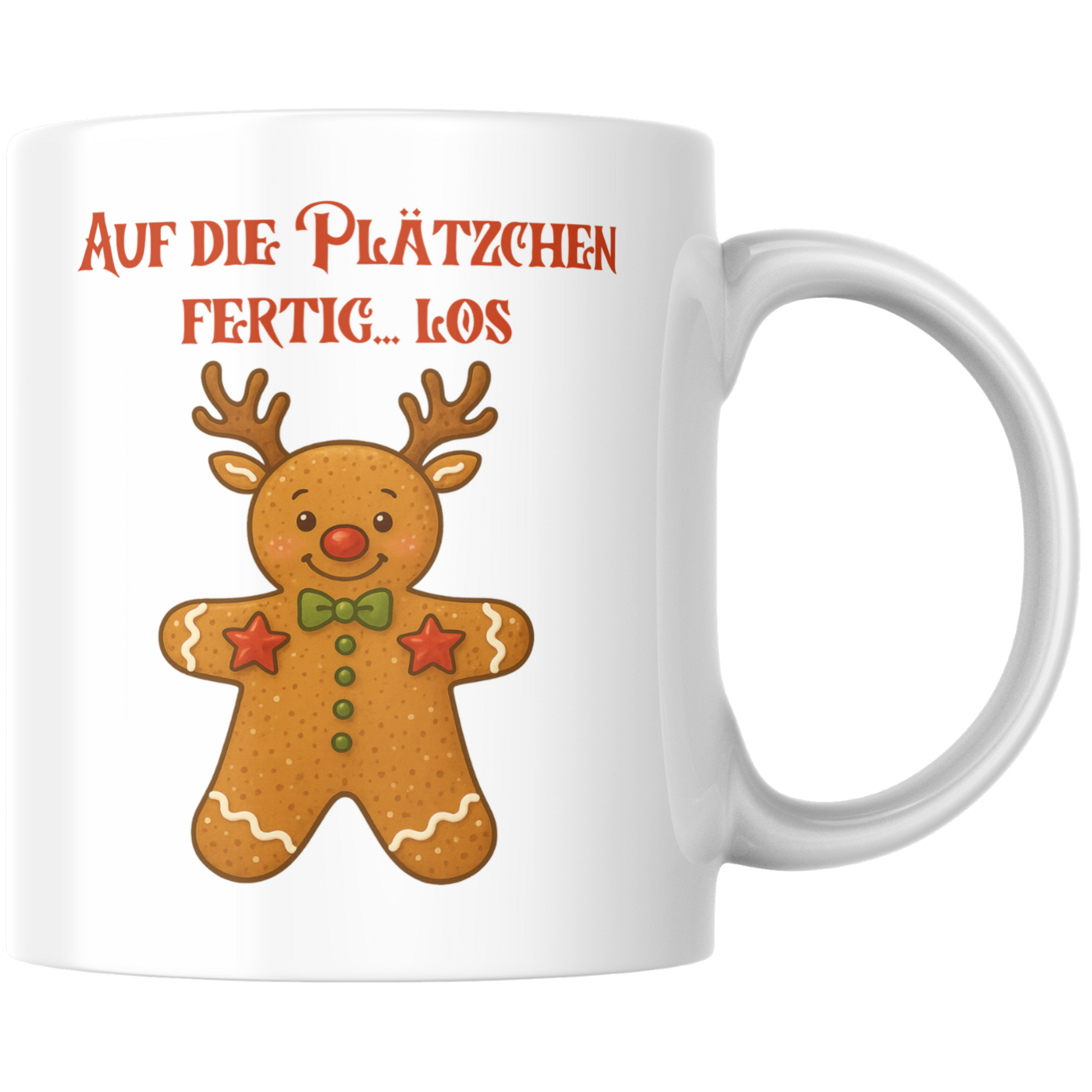 Ein fröhlicher Lebkuchenmann, gestaltet wie ein klassisches Weihnachtsplätzchen, strahlt auf dieser Tasse um die Wette. Zusammen mit dem Wortspiel „Auf die Plätzchen, fertig, los!“ entsteht ein humorvolles Motiv, das perfekt die Vorfreude auf die süßeste Zeit des Jahres einfängt. Ideal für alle, die Weihnachten lieben – und Plätzchen noch ein bisschen mehr.