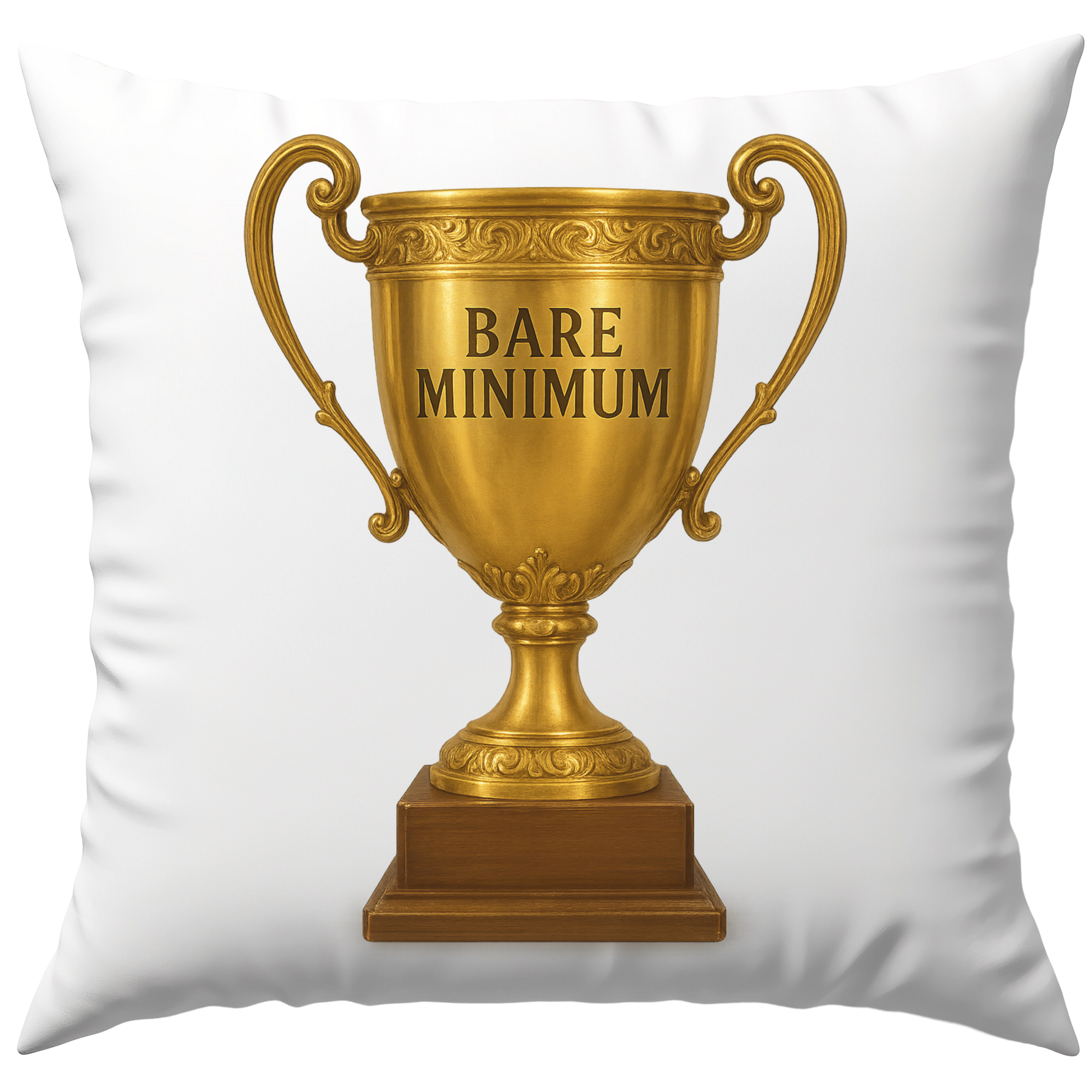 Dieses ironische Design feiert den wohl charmantesten Lifestyle überhaupt: Ein goldener Siegerpokal, der stolz den Schriftzug „Bare Minimum“ trägt, macht klar, dass auch minimaler Aufwand manchmal für den ersten Platz reicht. Humorvoll, selbstironisch und absolut zeitgeistig bringt dieses Motiv genau die richtige Portion Meme-Energie in dein Zuhause – perfekt für alle, die mit dem Nötigsten glänzen.