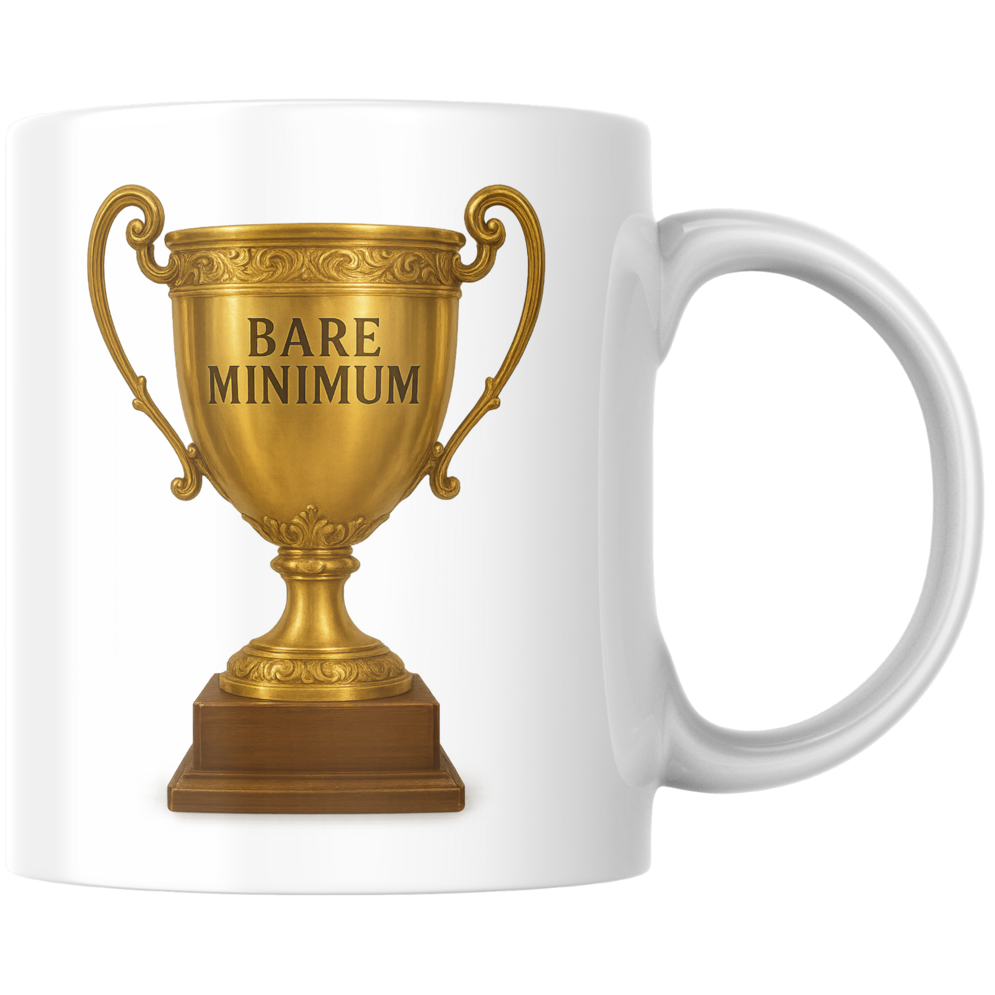 Ein goldener Siegerpokal, der stolz den Schriftzug „Bare Minimum“ trägt, macht diese Tasse zum perfekten Meme-Moment in Keramikform. Das ironische Design feiert selbstbewusst jene, die mit charmantem Minimalismus durchs Leben gleiten – und dabei trotzdem irgendwie den ersten Platz abräumen. Humorvoll, selbstironisch und absolut alltagstauglich.