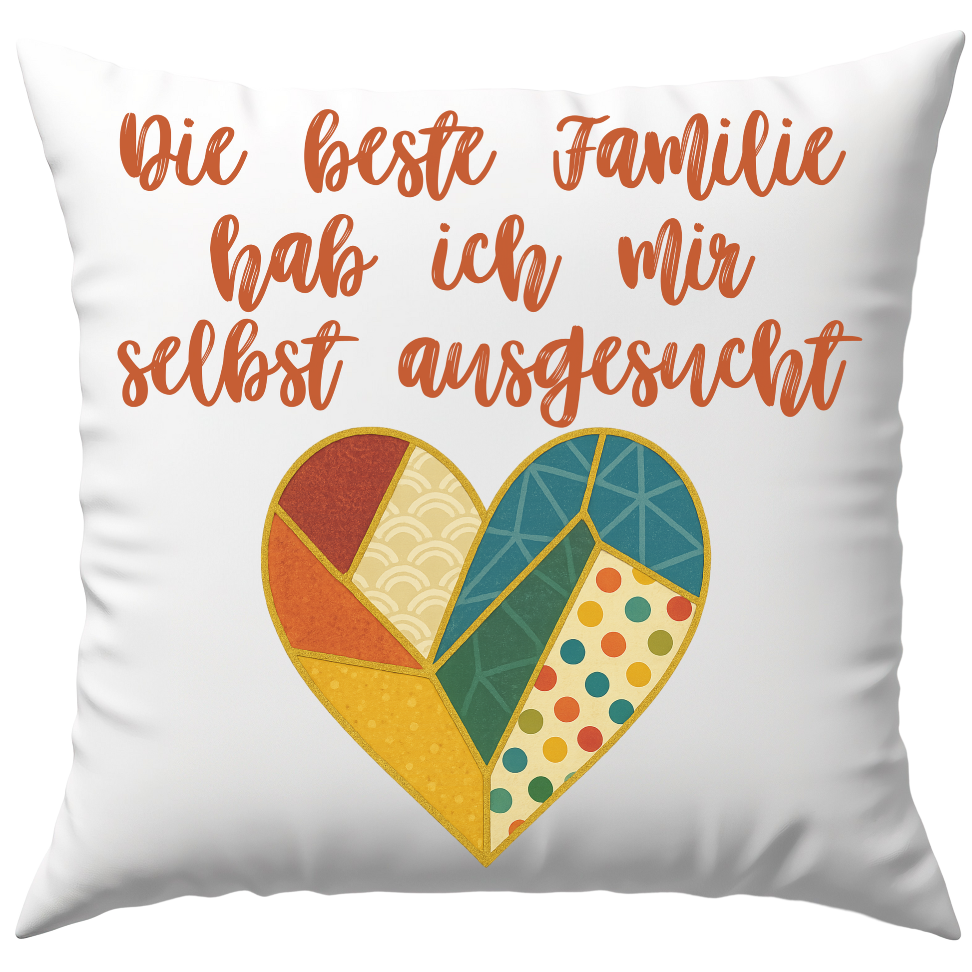 Dieses emotionale Design erzählt eine besondere Geschichte von Zusammenhalt und Wahlverwandtschaft: Ein kunstvoll zusammengesetztes Herz aus unterschiedlichen Fragmenten, verbunden durch goldene Linien, symbolisiert Stärke, Heilung und die Schönheit selbstgewählter Verbindungen. Der Spruch „Die beste Familie hab ich mir selbst ausgesucht“ verleiht dem Motiv eine warme, ehrliche Tiefe und macht sichtbar, was Patchwork-Familien so einzigartig macht – Vielfalt, Liebe und echtes Miteinander.