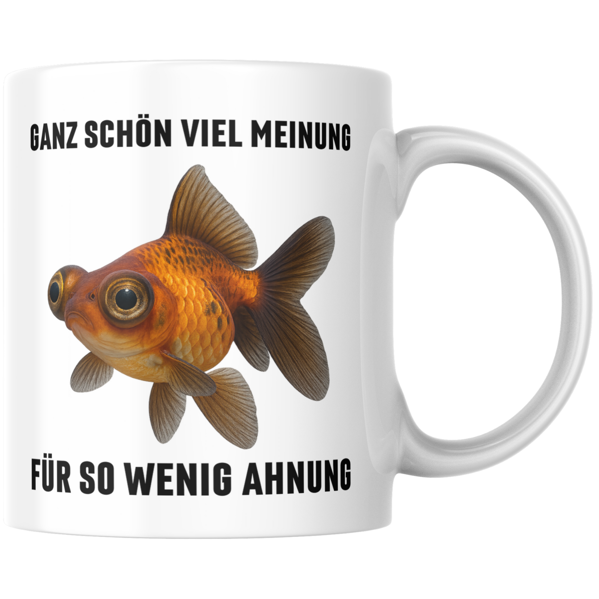 Dieses freche Design zeigt einen Teleskop-Goldfisch mit riesigen Augen, der den Spruch „Ganz schön viel Meinung für so wenig Ahnung“ perfekt begleitet. Die Kombination aus bissigem Humor und tierischem Motiv macht die Tasse zu einem echten Hingucker – ein Statement, das gleichzeitig charmant und provokant wirkt.