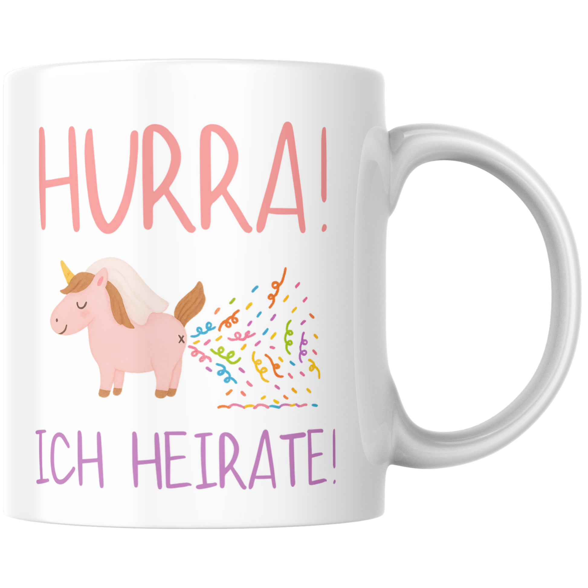 Dieses fröhliche Design zeigt ein strahlendes Einhorn mit Brautschleier, das fröhlich Konfetti pupst – eine herrlich verspielte Illustration, die den Spruch „Hurra! Ich heirate!“ perfekt unterstreicht. Süß, frech und glitzernd verkörpert die Tasse all die Vorfreude, die mit der Verlobung und den Hochzeitsplänen einhergeht.