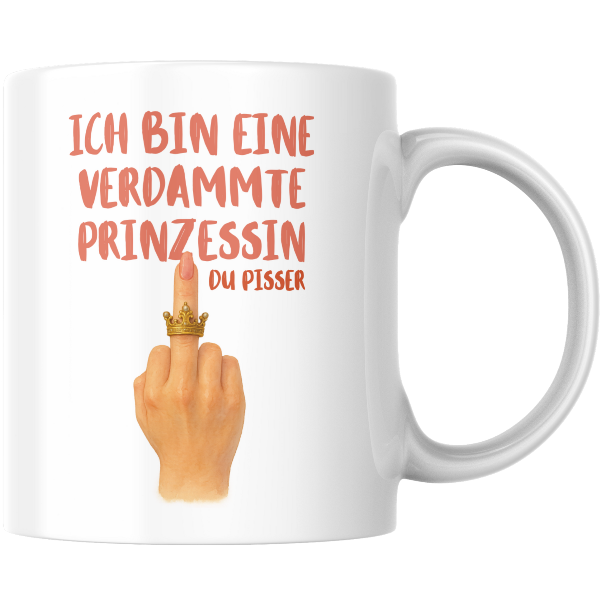 Dieses provokante Design zeigt eine Frauenhand mit erhobenem Mittelfinger – gekrönt von einem funkelnden Ring in Form einer Prinzessinnenkrone. Der freche Spruch „Ich bin eine verdammte Prinzessin, du Pisser“ verbindet royalen Glamour mit rebellischem Humor und macht die Tasse zu einem Statement für alle, die sich nichts gefallen lassen.