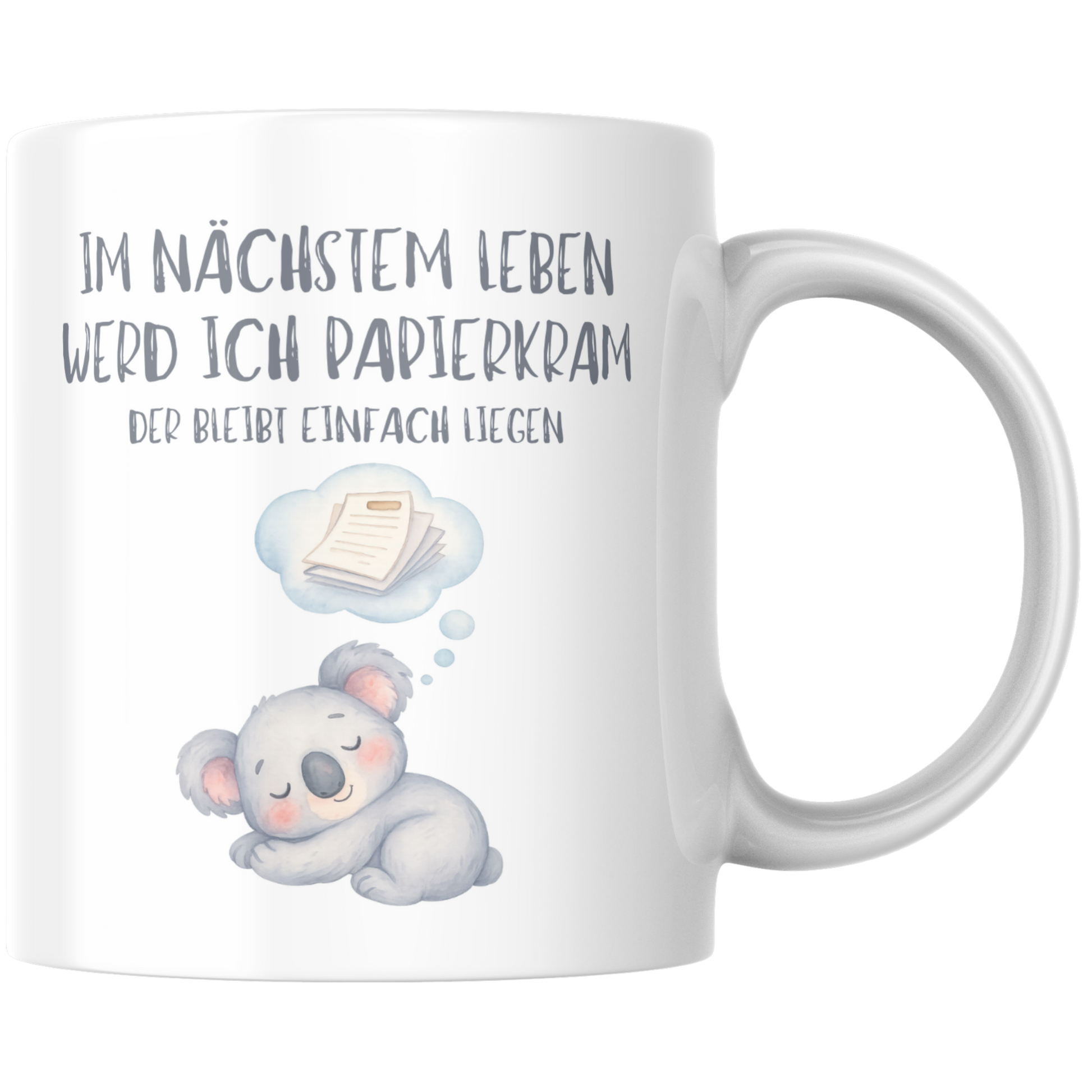 Dieses charmante Design zeigt einen gemütlich schlafenden Koala, der von Aktenstapeln und Formularen träumt. Der Spruch „Im nächsten Leben werd ich Papierkram – der bleibt einfach liegen“ fasst den alltäglichen Kampf mit Bürokratie herrlich ironisch zusammen und macht die Tasse zu einem humorvollen Statement gegen Stress.
